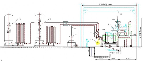 1—液氧站 2—液化天然氣站 3—氧氣和天然氣計(jì)量系統(tǒng) 4—燒咀冷卻水系統(tǒng) 5—純氧燒咀 6—3噸澆包
