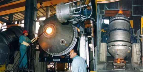 7—3噸純氧燃?xì)饣F爐 8—加料溜槽 9—加料桶 10—5噸梁式吊車