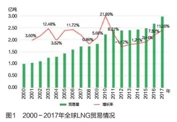 2017年,全球液化天然氣(LNG)貿(mào)易量再創(chuàng)歷史新高,達(dá)到2.97億噸(約3900億立方米),比上年增長了2989萬噸。全球LNG貿(mào)易量增速延續(xù)了近5年的良好勢頭,增長率在2017年重回兩位數(shù),達(dá)到了11.20%,這是2011年以來全球LNG貿(mào)易量的高增速(見圖1)。