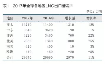 亞太地區(qū)保持著全球主要出口地區(qū)的地位。隨著新興項(xiàng)目的不斷投產(chǎn),澳大利亞和美國是近兩年LNG出口增加多的國家,2017年這兩個(gè)國家的出口增量占全球貿(mào)易增量的70%以上。非洲地區(qū)傳統(tǒng)出口國生產(chǎn)的恢復(fù),也為全球LNG出口增加貢獻(xiàn)了力量(見表1)。