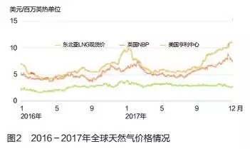 2017年全球天然氣價(jià)格回升,美國亨利中心(Henry Hub)和歐洲NBP價(jià)格以及東北亞LNG現(xiàn)貨價(jià)格呈現(xiàn)不同程度的增長(見圖2)。