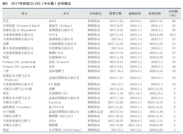 2017年全球新簽訂LNG貿(mào)易合同67個(gè),除去現(xiàn)貨合同(2年及以內(nèi))以外,3~5年的中期合同有10個(gè),10年及以上的長期合同有14個(gè)(見表6)。