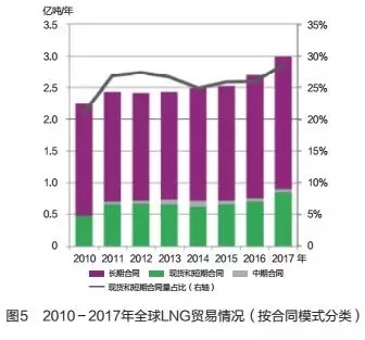 2011年以來,受季節(jié)性短期需求的拉動(dòng),加之浮式技術(shù)的快速發(fā)展,全球LNG現(xiàn)貨和短期(合同期在2年以內(nèi))貿(mào)易呈現(xiàn)快速增長態(tài)勢。2017年,全球LNG現(xiàn)貨和短期貿(mào)易量為8900萬噸,約占全球LNG貿(mào)易總量的30%,比上年增加了2084萬噸,增幅達(dá)23.4%(見圖5)。