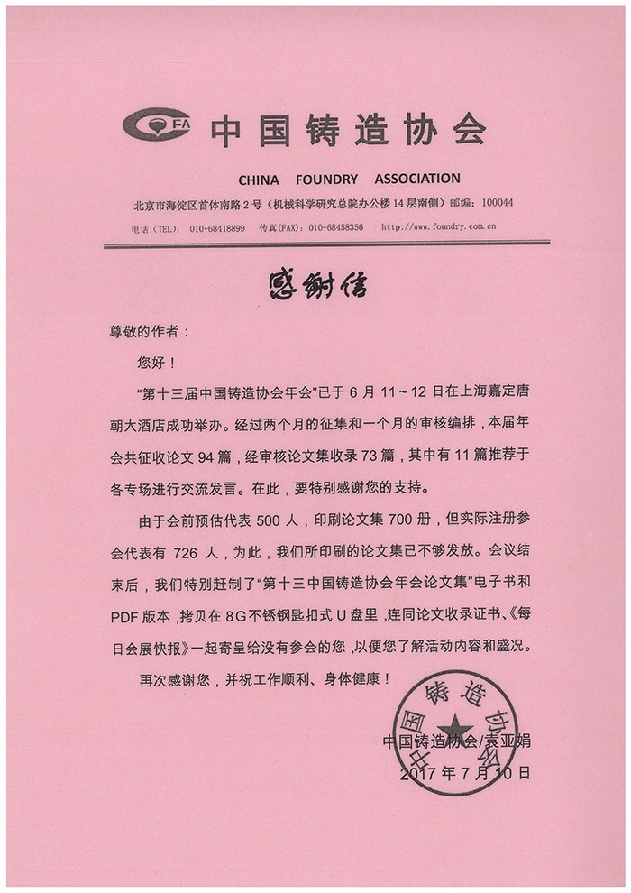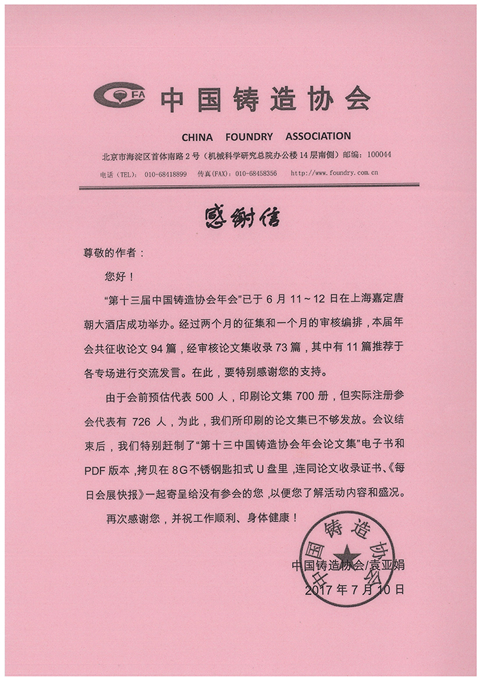 中國(guó)鑄造協(xié)會(huì)感謝信